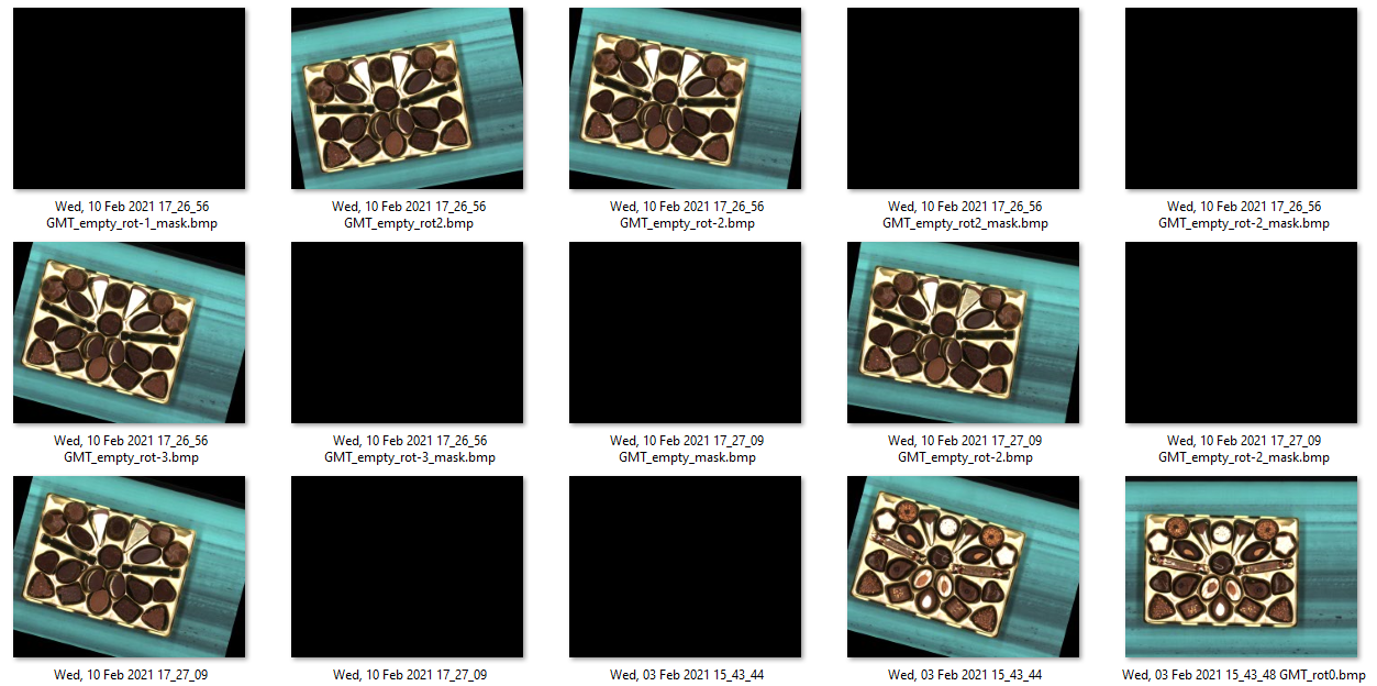 Just 15 images is not enough fo AI to understand all concepts of what candy is. So i'm using quite standard trick to extend the data set. To do that i'm addig small rotation in both directions. Together with “empty” images(with empty blister and truned over candies) this will generate a dataset of about 300 images(black images are masks with candy position and class, windows can't decode them propperly):
